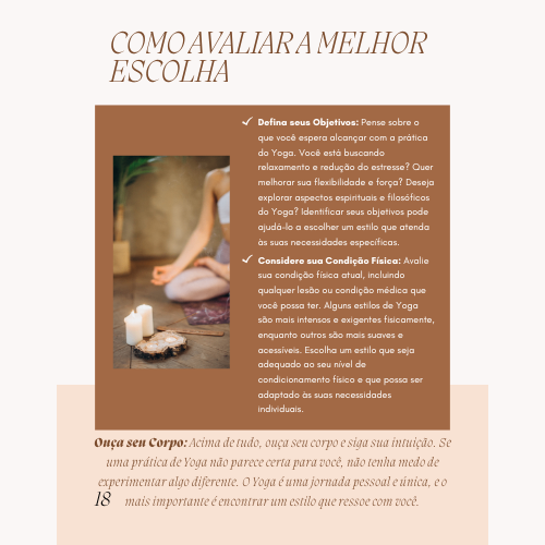 Desde o dinâmico Vinyasa até o meditativo Yin, cada estilo é cuidadosamente explicado, destacando suas particularidades e benefícios.